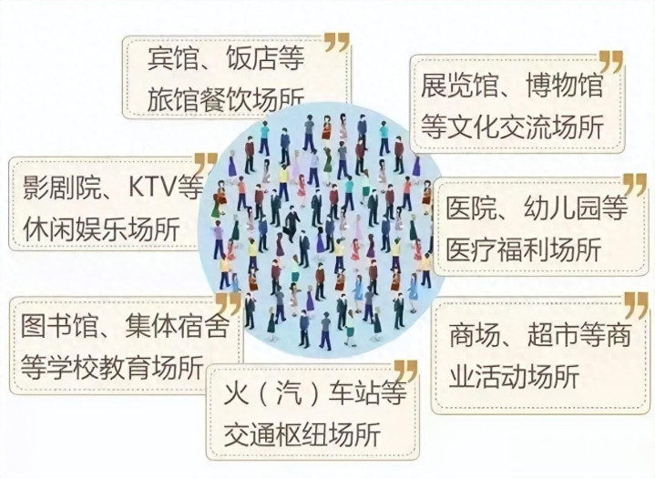 人员密集场所通常指:商场、超市、娱乐场所、景区、车站等人员高度聚集的场所。