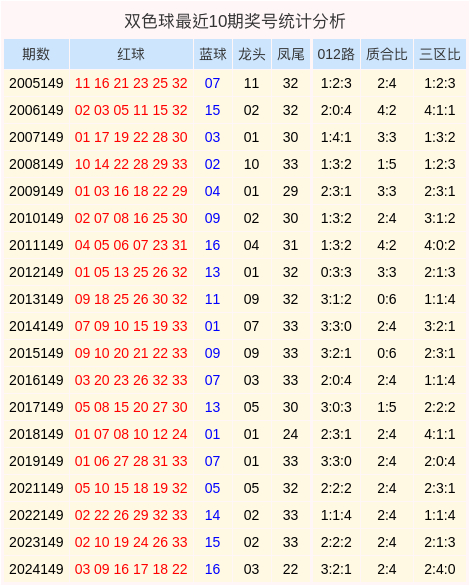 蓝球分析:历年同期中蓝球的大小比为10:9,去年同期蓝球开出16,本期预测开出大数蓝球号码:11。