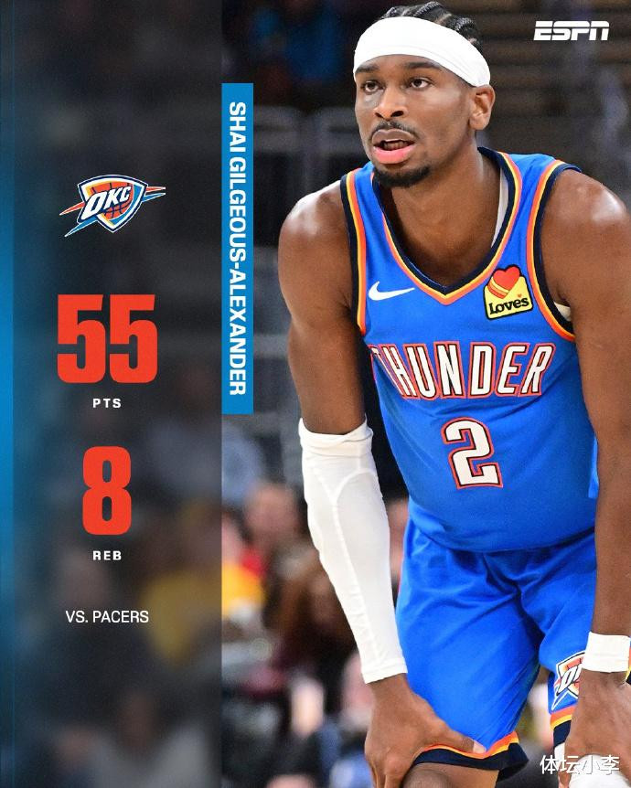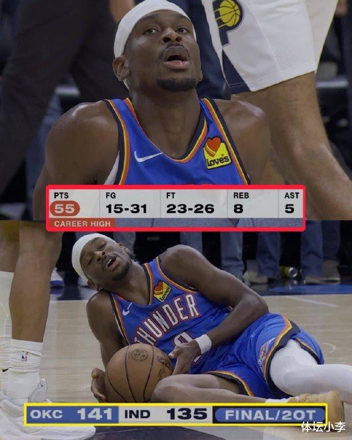 本场比赛成为了亚历山大的个人秀,打出了生涯之夜的表现,出战45分钟,31投15中,三分7中2,罚球26罚23中,拿到55分8篮板5助攻2抢断的全面表现。这当中55分也是创下他生涯新高,26次罚球也刷新生涯新高,让步行者3名外线防守球员全都6犯下场,分别是内史密斯、马瑟林和谢泼德。