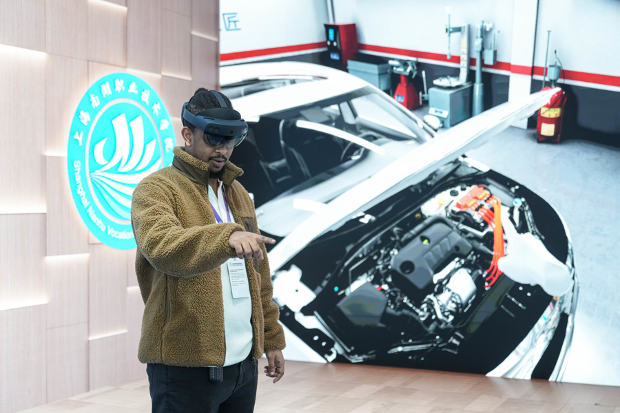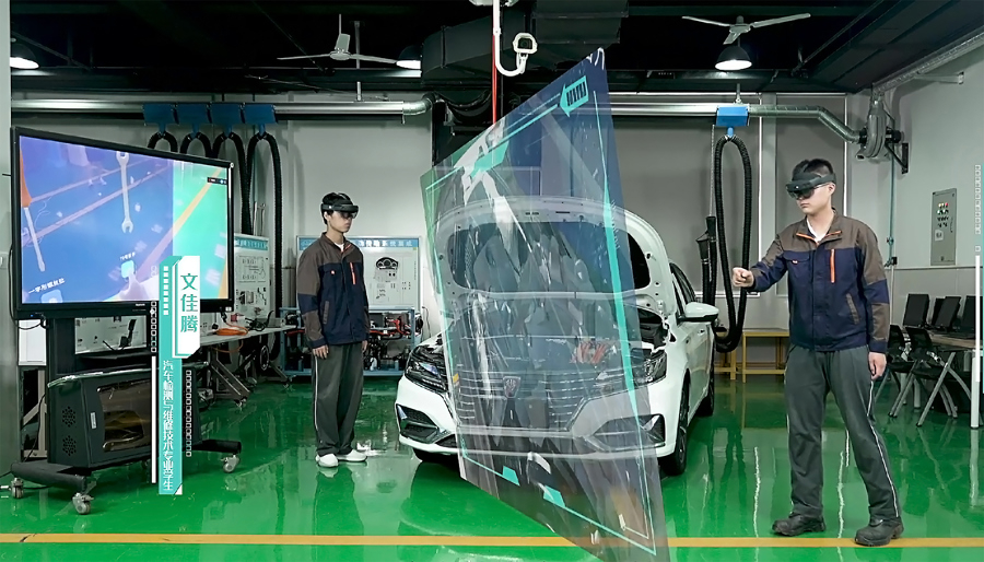 戴上专门的眼镜,在虚拟世界中,拿出扳手,就能在新能源汽车发动机上操作。同时,零部件的各种指标参数以及相关的操作手册,都会同步显示在眼前。“就好像钢铁侠在头盔里看到的一样。”如今,这一“5G+XR全息虚拟实训”课堂出现在上海南湖职院。