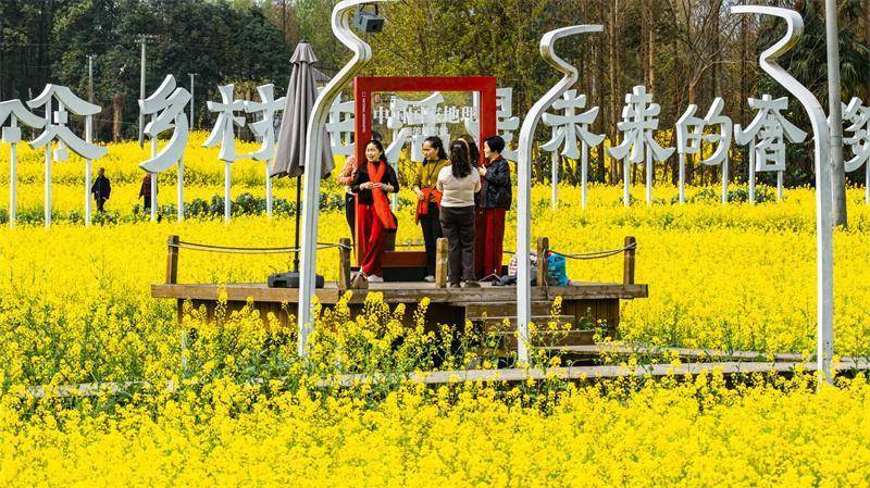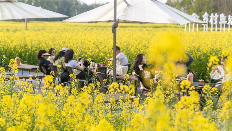 在油菜花海中与亲朋好友畅谈。崇州市融媒体中心供图