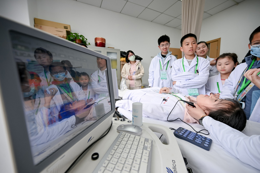 “以前只知道心脏有心电图,原来肌肉和大脑也有自己‘专属的密码本’!”青少年体验者小唐说。神经内科医生为青少年演示肌电图、脑电图检测,并介绍工作原理,“当出现不明原因的肌肉萎缩、手脚麻木、四肢乏力的症状时,可以借助肌电图检查来明确病因;当遇到意识障碍、昏厥、癫痫等脑部器质性病变时,这时就需要进行脑电图检查。”在脑电图体验区,通过附着在头皮上的电极,即可精准捕捉并记录大脑神经细胞活动产生的微弱生物电信号。青少年认真观察监测屏上的脑电波图谱,了解每个人的脑电图都是独一无二的“生物指纹”。