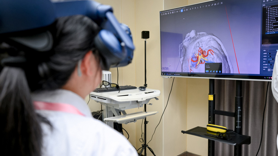 在医学模拟实训中心,青少年化身“小小神经外科医生”,沉浸式体验高精度手术。他们穿戴专业VR设备,在三维重建的颅脑模型中辨识神经血管,以第一人称视角观察病灶位置,在虚拟空间中体验精细化模拟手术操作。